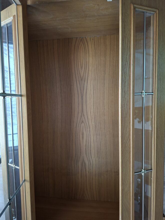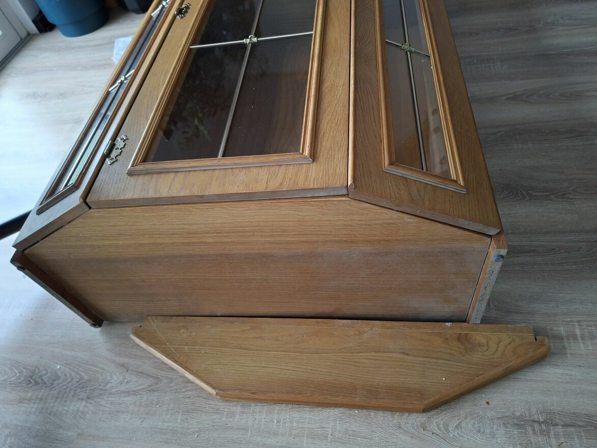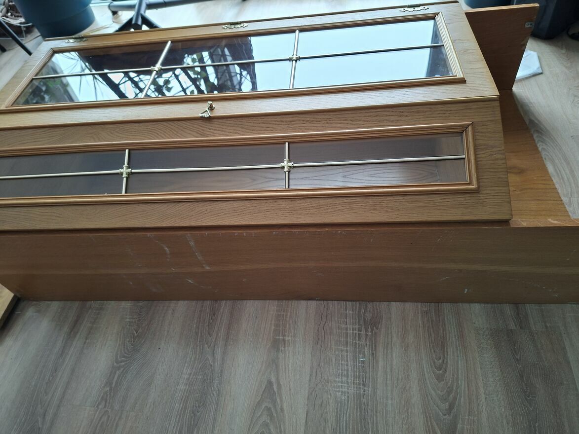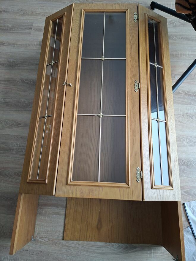 Sprzedam solidną witrynę drewnianą z przeszklonymi drzwiami. Klasyczny styl, ciepły kolor drewna. Fronty ze szkłem z ozdobnymi szprosami. Mebel stabilny, dobrze wykonany, ciężki – nie jest to „papierówka”.Stan dobry – normalne ślady użytkowania, bez poważnych uszkodzeń. Zawiasy i drzwiczki sprawne, szkło całe.